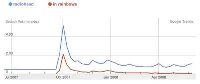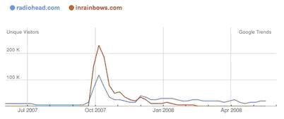 Láthatjuk azt, hogy 2007 Októberében a radiohead.com (kék vonal) nagy népszerűségnek örvendett. Az In Rainbows megjelenése egyértelműen több embert vonz a banda oldalara. Az album oldala, inrainbows.com (piros vonal) még drámaibb ugrást mutat. Valószínűleg azért mert onnét lehetett letölteni az albumot. Megfigyelhető továbbá az is, hogy a radiohead.com oldal forgalma tovább növekedett még akkor is amikor az inrainbows.com forgalma csökkent.