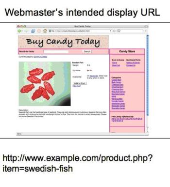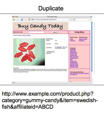 Amikor URL paramétereket használunk a felhasználók és más információk nyomkövetésére, duplikált tartalmak keletkezhetnek abban az esetben, ha ugyanaz az oldal tartalom számos különböző URL-en keresztül elérhető. Ezt a következő példában megfigyelhetjük – a példa Adam Lasnik-tól származik -, amiben egy webáruház terméke érhető el különböző URL-eken. A példa szerint 3 különböző URL ugyanarra a konkrét termékre utal: